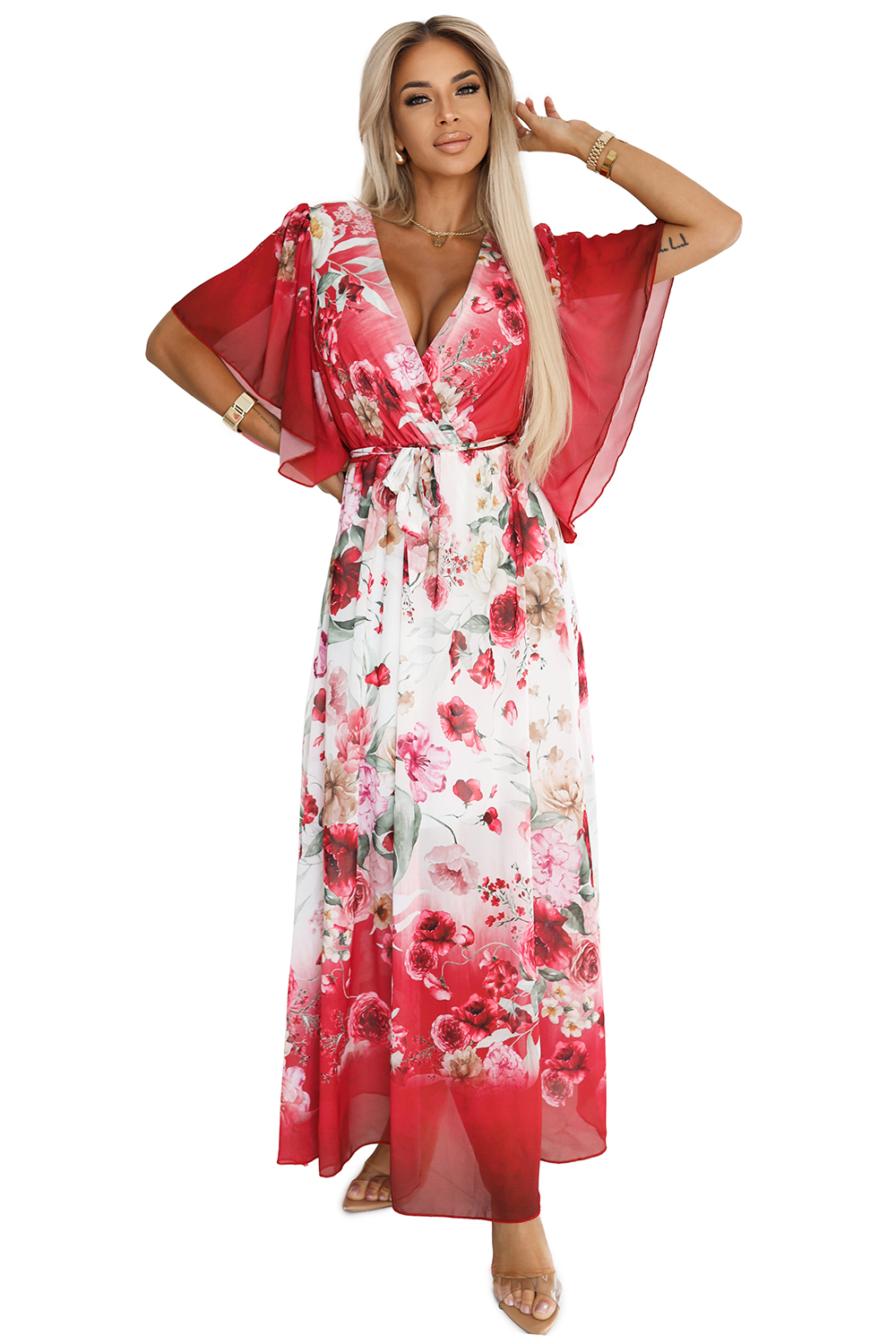 603-1 Vzdušné zavinovací maxi šaty s květinovým vzorem - červené růže