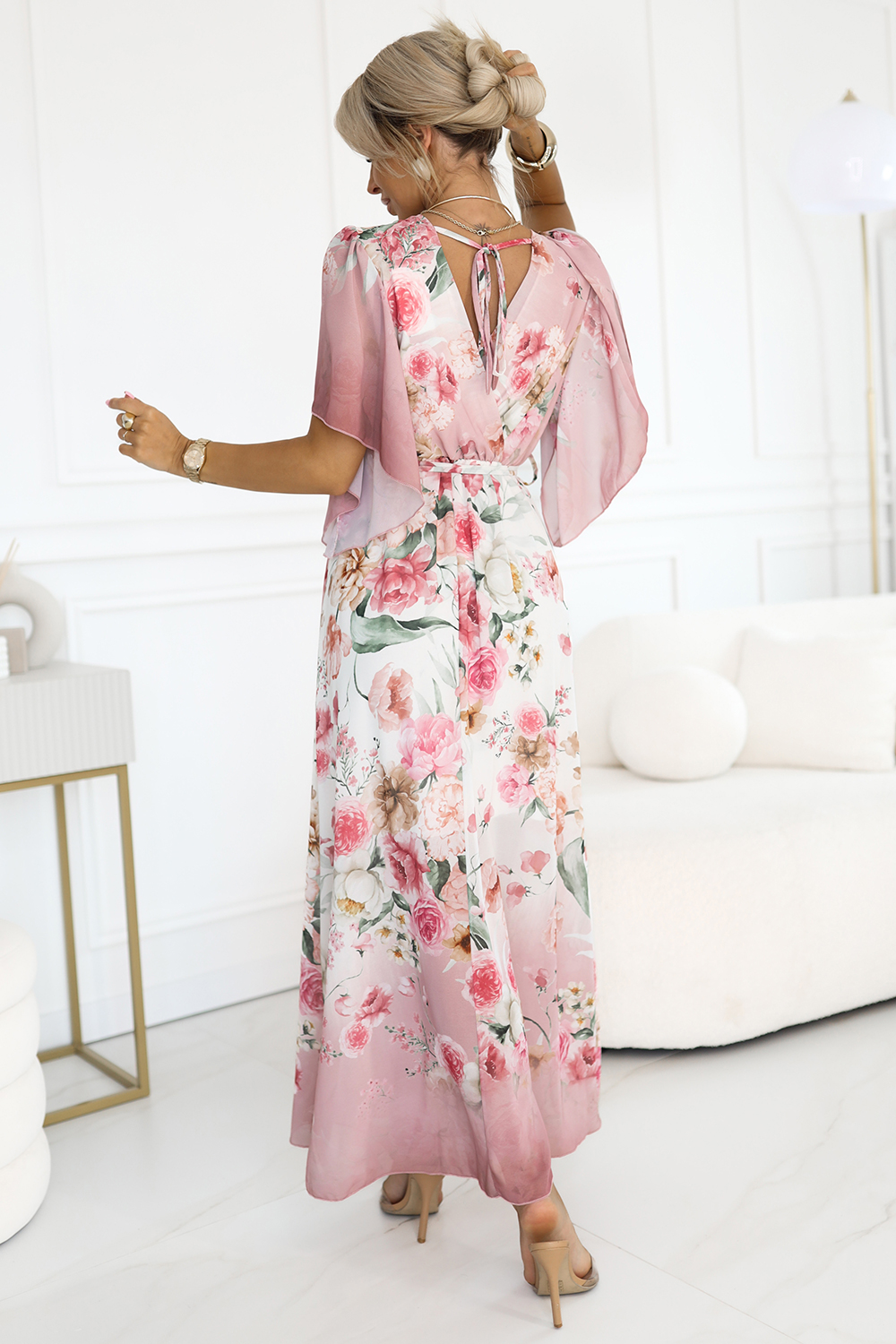 603-4 Vzdušné zavinovací maxi šaty s květinovým vzorem - růžové růže