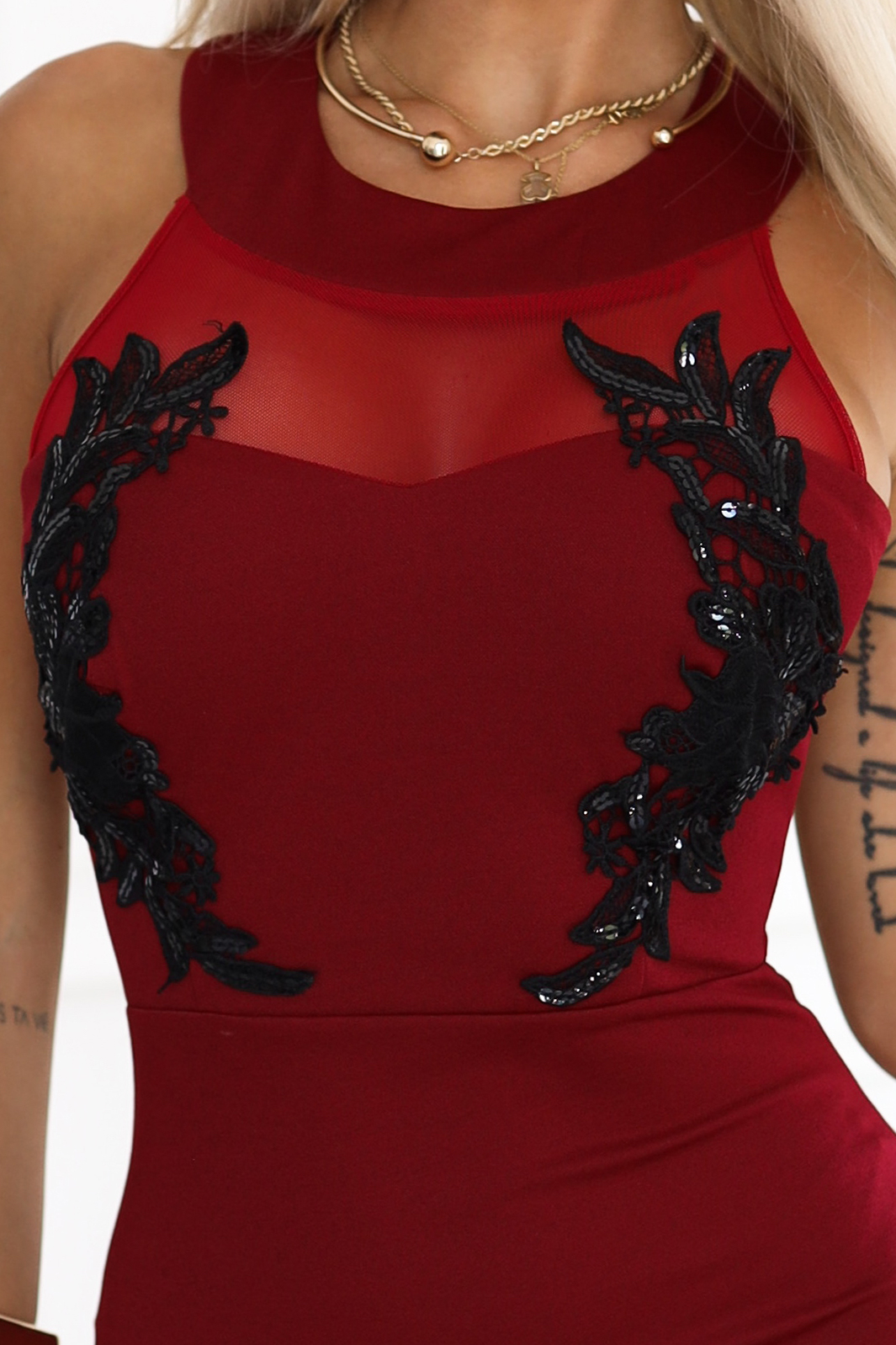 617-2 Dlouhé šaty s mořskou pannou s černou krajkou a síťovinou - vínové