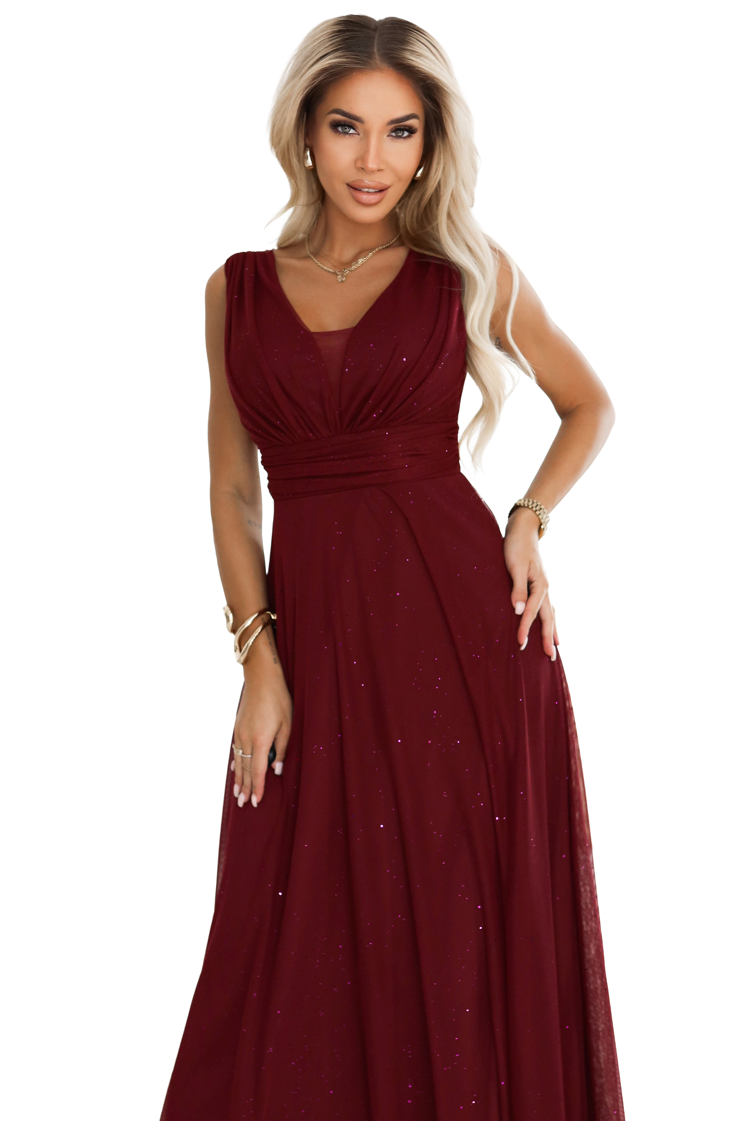 637-1 Dlouhé večerní šaty s brokátovým akcentem a hlubokým výstřihem - vínové
