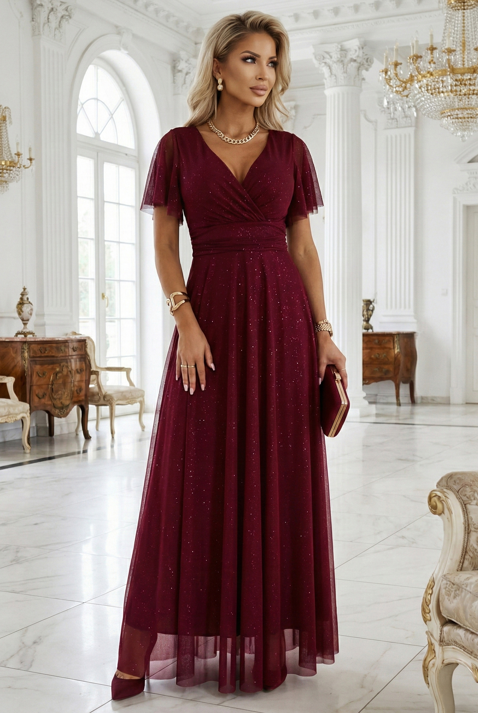 Představte si okamžik, kdy vstupujete do sálu a světla jemně tančí na vaší siluetě. Tyto burgundské maxi šaty jsou víc než kreace - jsou to slib nezapomenutelného večera. Vytvořené pro ženu, která chce kombinovat klasickou eleganci s trochou hvězdného prachu. Hluboký, vinný odstín burgundské v kombinaci s tisíci drobnými třpytkami způsobuje, že každý okamžik v těchto šatech nabývá filmového charakteru.