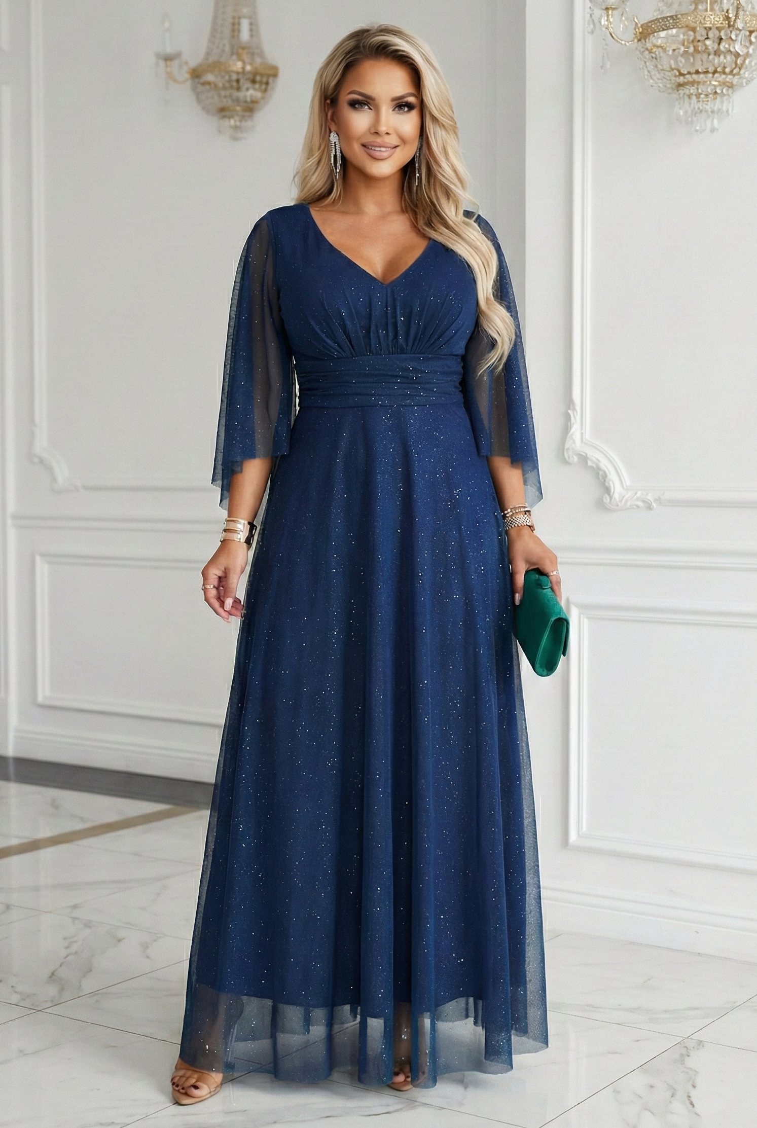 Lehce lesklá látka s jemným třpytem vytváří efekt "hvězdného lesku", který krásně vypadá ve večerním světle. Zavinovací V-výstřih zeštíhluje krk a opticky tvaruje horní část siluety, zatímco široký, stabilní pás v pase dává postavě proporce. To je obzvláště důležité pro ženy hledající večerní šaty plus size, které skutečně zlepšují linii pasu.