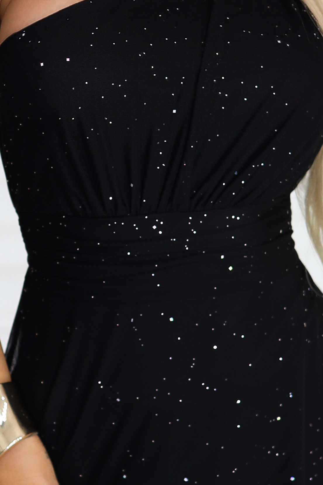 Černé maxi šaty s třpytivým leskem na jedno rameno - Numoco Basic
