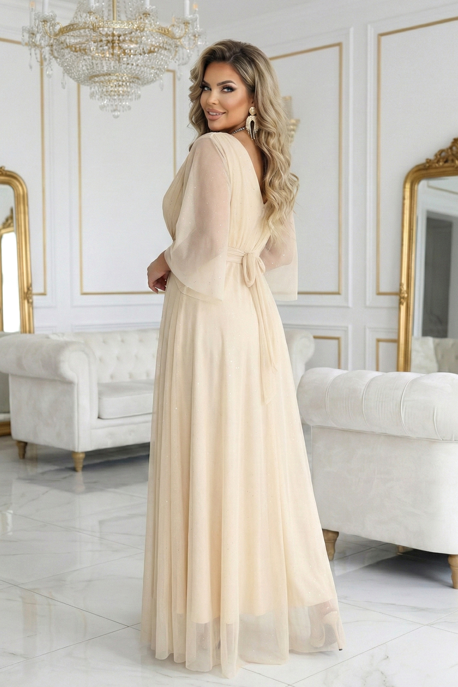 Maxi šaty v barvě šampaňské béžové s průhledným rukávem a vázáním v pase - Numoco Basic